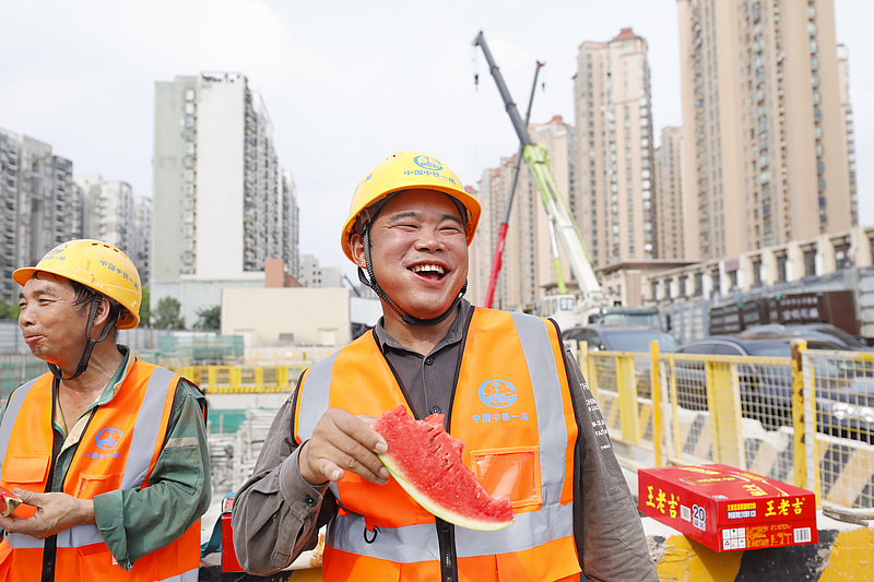 7月17日,武汉轨道交通12号线(武昌段三标)施工现场,310名在高温下坚守的建设者领到由湖北省总工会送来的西瓜、王老吉、盐汽水等“清凉礼包”。
